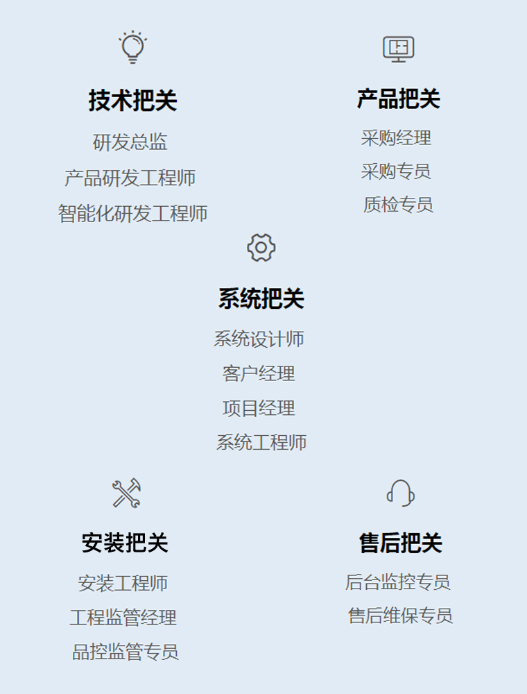 • 通过标准化体系,对安装、调试及验收进行规范整理降低个体因素对技术系统整体品质的影响。
