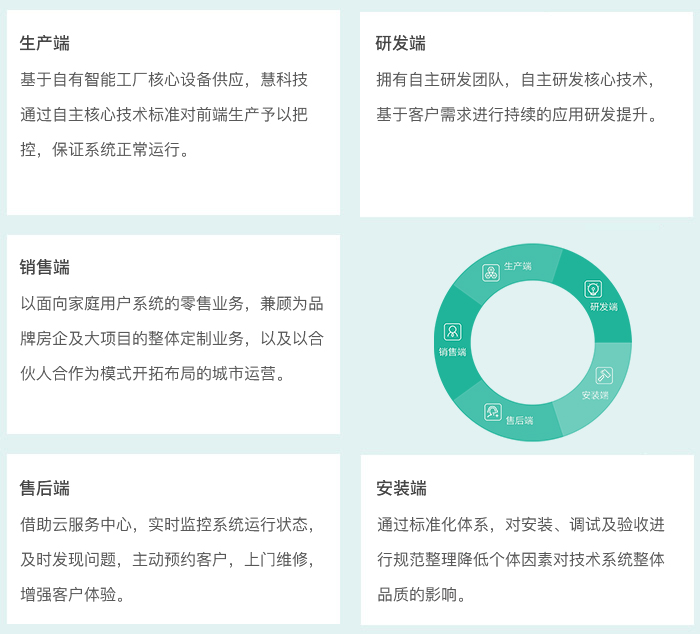 • 基于自有智能工厂核心设备供应,慧科技通过自主核心技术标准对前端生产予以把控,保证系统正常运行。